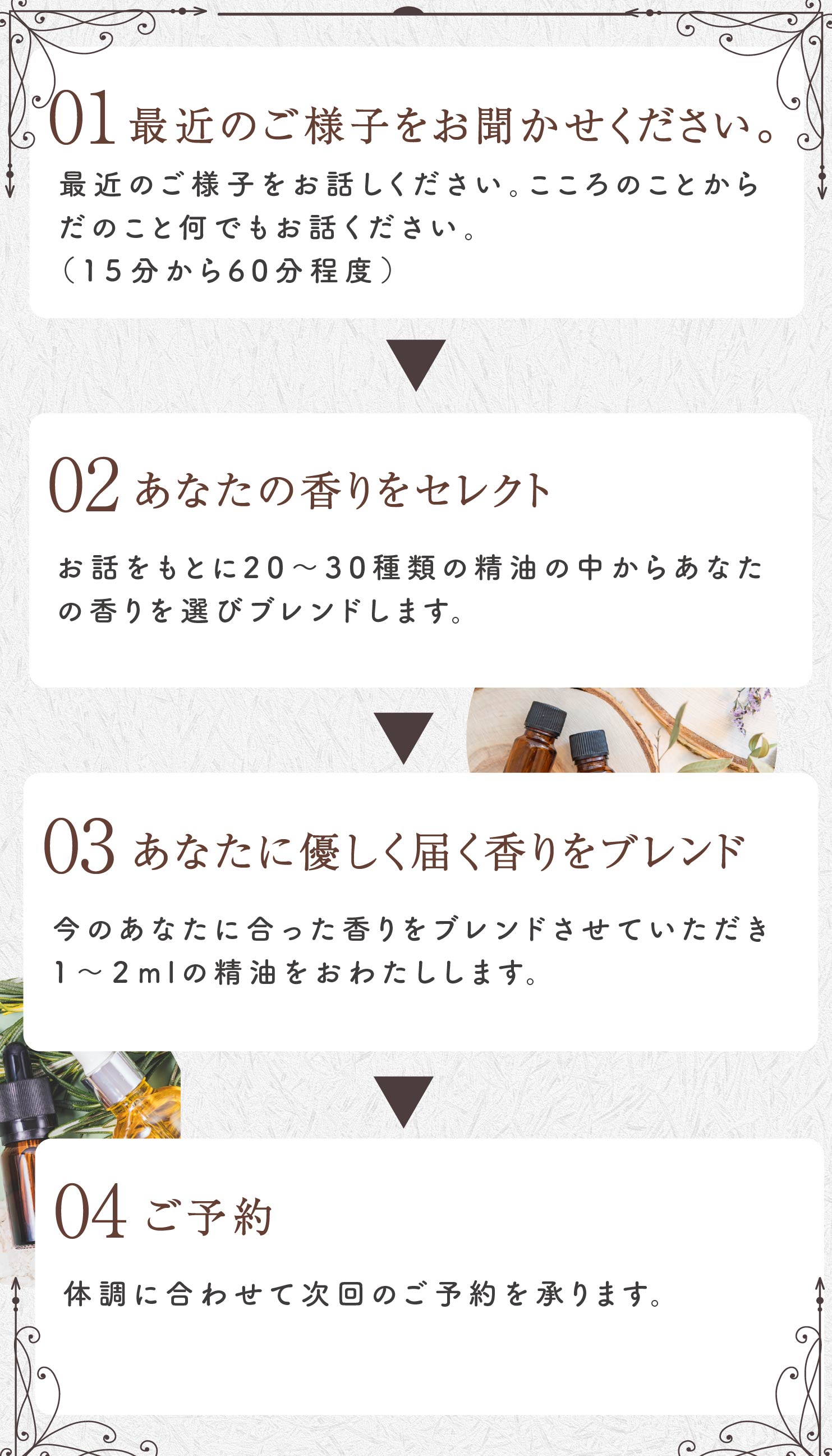 ※ 当院での他科の診察や検査と同じ日には、アロマケア外来のご予約はできないことを予めご了承ください。