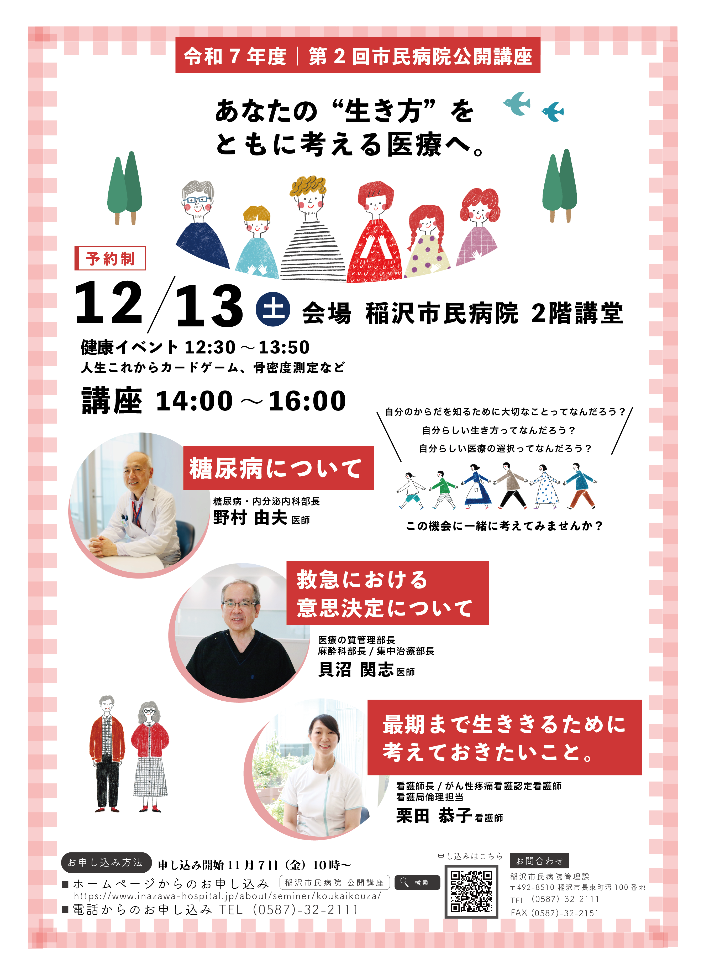 今回は、「糖尿病について」当院の糖尿病・内分泌科部長の野村医師が講師をつとめます。糖尿病の予防とは?なぜ、血糖のコントロールが大切なのか?これから暴飲暴食になりがちな時期になりますが・・・一緒に糖尿病について学びませんか?もう一つのテーマは、「意志決定支援」に関する講演です。救急の現場で、目の当たりにする意志決定の場。本人の意思が大切になります。この点を踏まえて集中治療部長でもある貝沼医師が講師をつとめます。また、最期まで生ききるために今から考えておきたいことは何か?について看護局倫理担当をしている栗田看護師が講師をつとめます。きっと、あなたにとって何か感じる講演になると思います。年末年始を迎える前のこの機会に参加してみませんか?