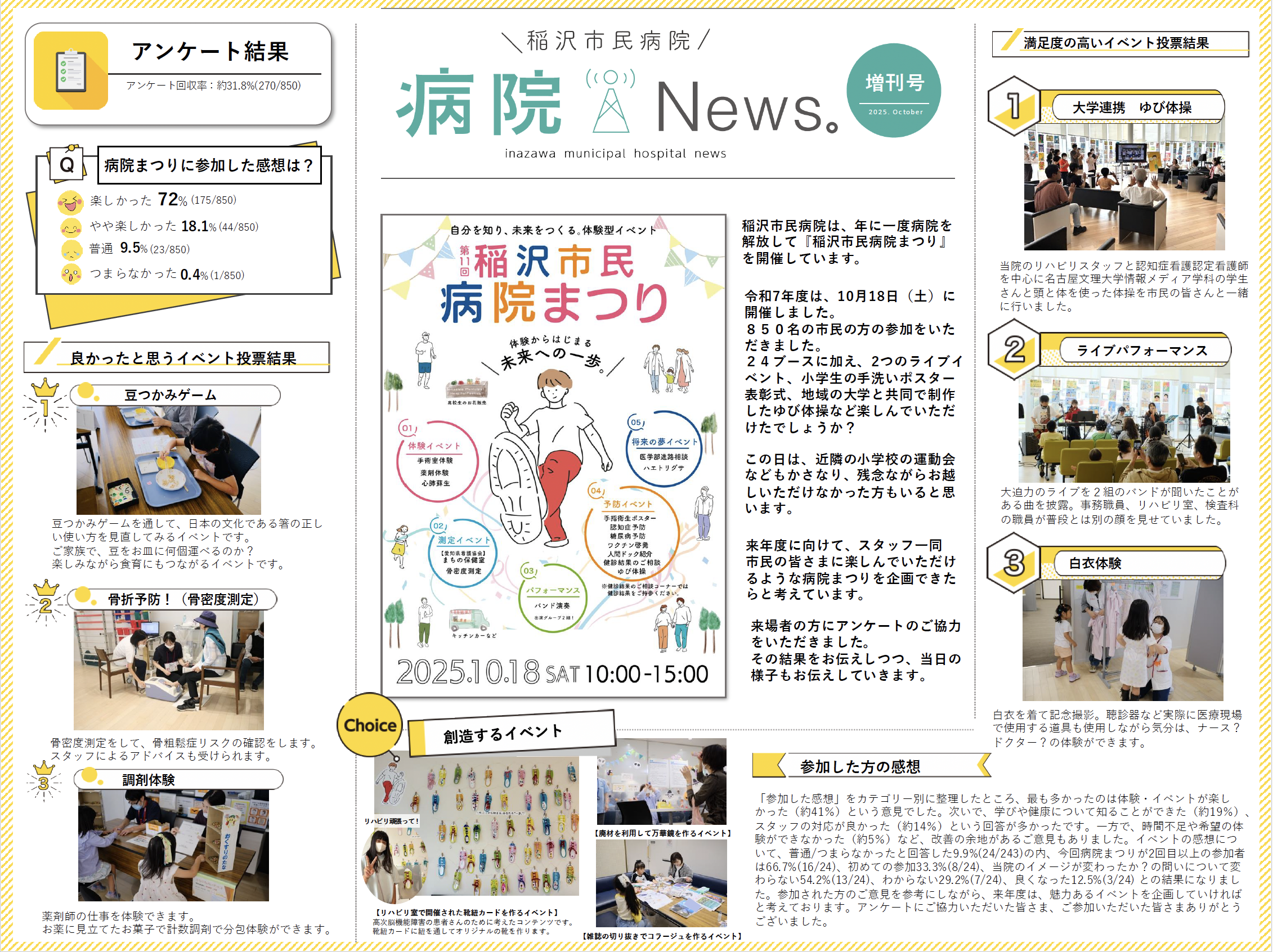 病院まつり 2025年 第11回病院まつりご参加いただきありがとうございました。 第11回病院まつりへのご参加ありがとうございました!!今回、増刊号!!と題しまして病院まつりのご報告をします☺️ 令和7年度第11回病院まつり増刊号 (PDF ファイル 1.26MB) 過去の「病院まつりの様子」はこちらからご覧いただけます↓↓